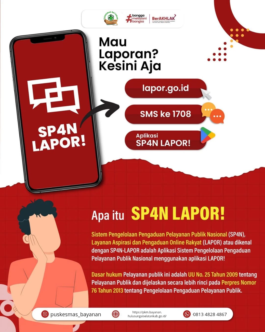Puskesmas Bayanan berkomitmen memberikan pelayanan terbaik bagi seluruh masyarakat. Jika Anda memiliki saran, aspirasi, atau keluhan terkait pelayanan publik, sampaikan melalui SP4N LAPOR! β sistem pengaduan resmi nasional yang terintegrasi dan mudah diakses.