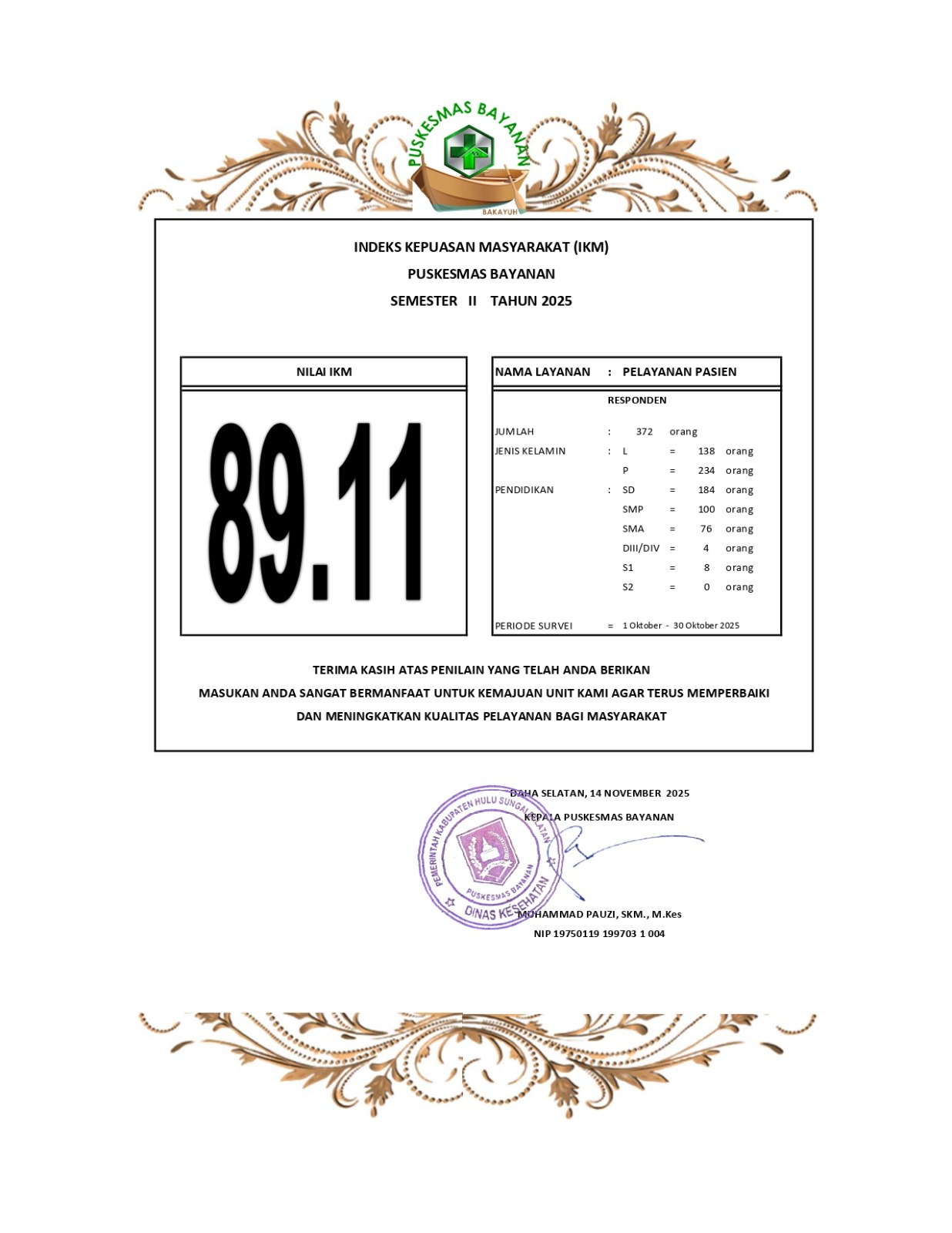 Puskesmas Bayanan memperoleh nilai IKM: 89,11 (Kategori Sangat Baik).
