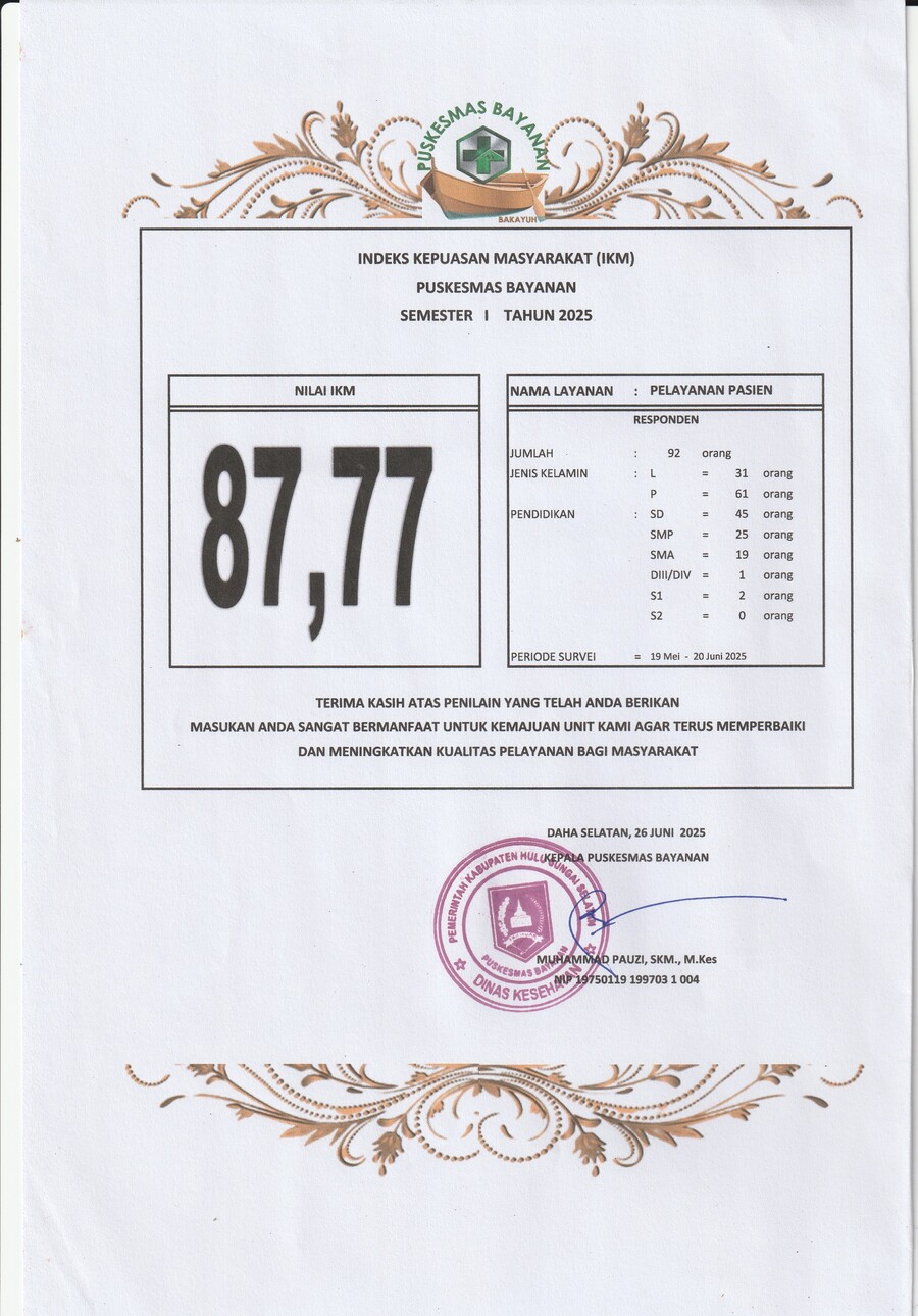 Puskesmas Bayanan telah melaksanakan Survei Indeks Kepuasan Masyarakat (IKM) pada Semester I Tahun 2025 terhadap layanan Pelayanan Pasien. Survei ini dilaksanakan pada periode 19 Mei – 20 Juni 2025, dengan jumlah responden sebanyak 92 orang yang terdiri dari 31 laki-laki dan 61 perempuan.